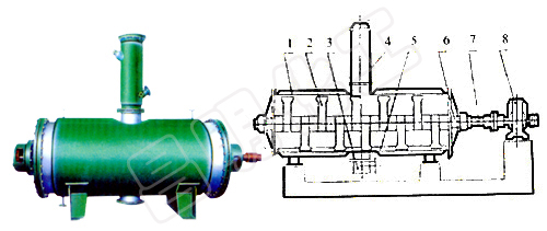 | 1、殼體 2、耙齒 3、出料裝置 4、加料裝置 5、粉碎棒 6、密封裝置 7、攪拌軸 8、傳動(dòng)裝置 |
